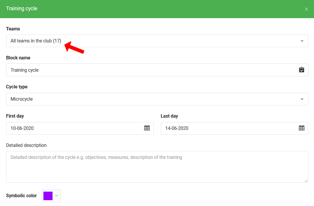 The last type of event you can add to your calendar as administrator is a training block. This is an extremely important element for planning your work in the club. It allows you to assign microcycle to specific teams. The first step in planning a training block is to select the teams you want to create a microcycle for. In the next few steps, you specify the name, color, description and duration of the training block.