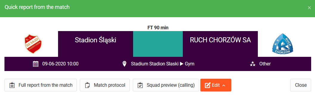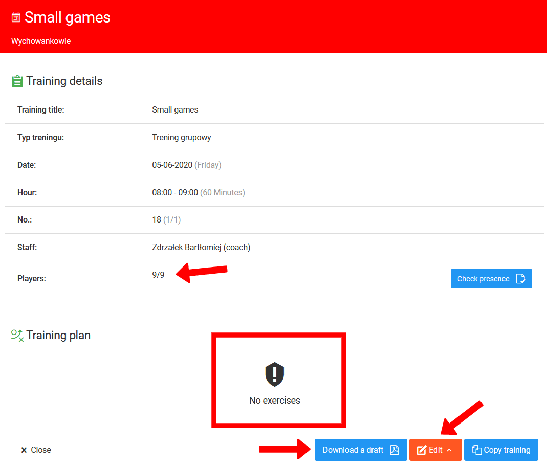 Another important feature you will find in your club calendar is the ability to control the details of each of the added training. By clicking on a training session in the calendar, you will see a window with the details of the session. Very quickly you will be able to verify whether the coach has prepared a draft or checked presence.