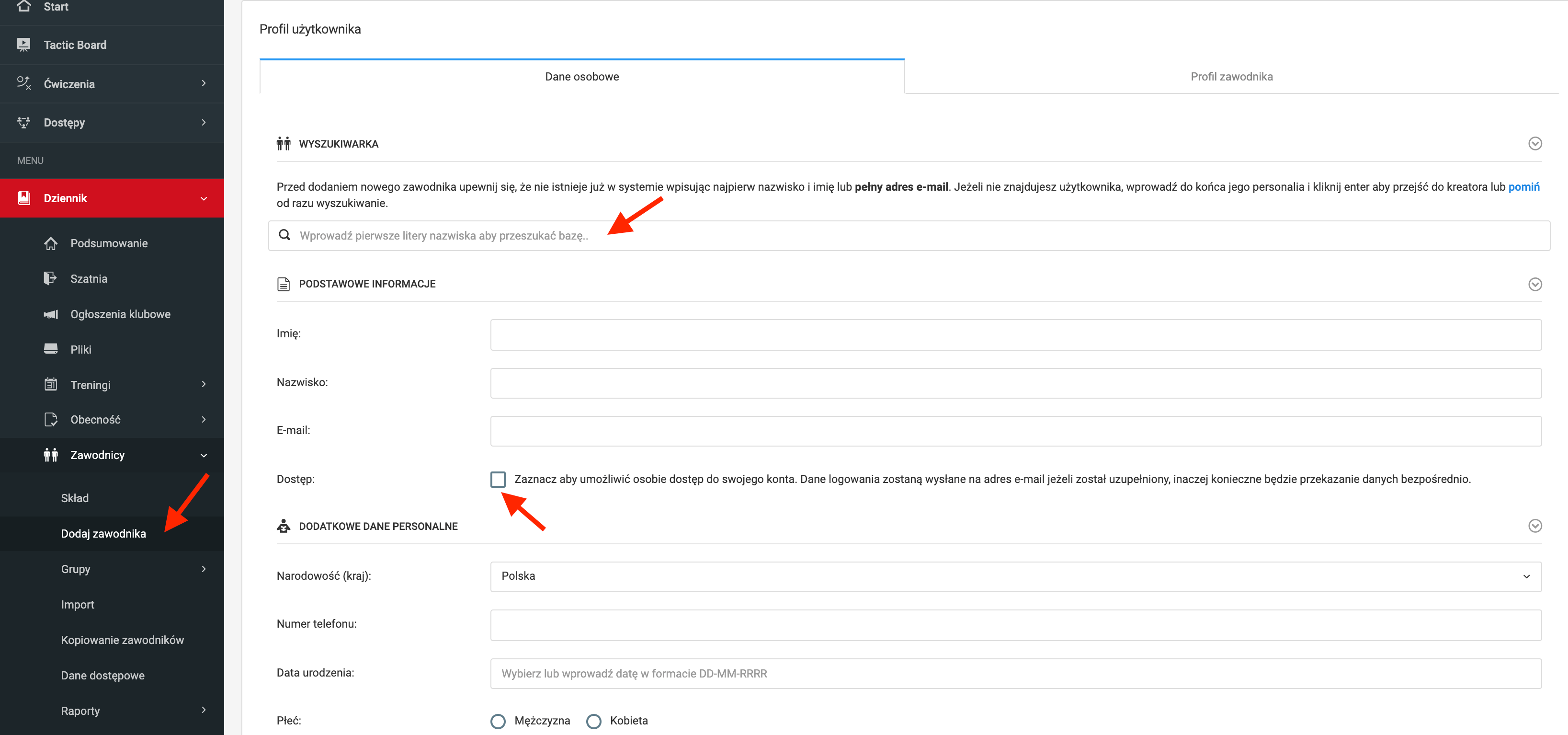 Aby dodać zawodników, w lewym menu wybierz opcję dziennik zawodnicy dodaj nowego. W kolejnym kroku przejdziesz do formularza dodawania nowego zawodnika. Jeżeli zawodnik znajduje się już w systemie, możesz wyszukać go w wyszukiwarce i w ten sposób dodać do swojej drużyny. Jeżeli jednak nie ma go jeszcze w systemie, stwórz go, nadając mu imię i nazwisko, e-mail oraz datę urodzenia. Jeżeli chcesz, aby zawodnika miał dostęp do systemu, nadaj mu także login i hasło, klikając w szary checkbox.